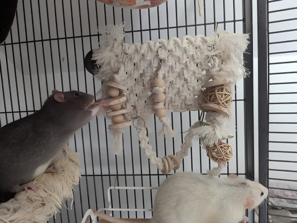 Hanging chew toys are suspended from the cage, encouraging rats to reach and gnaw. They combine exercise and dental care.